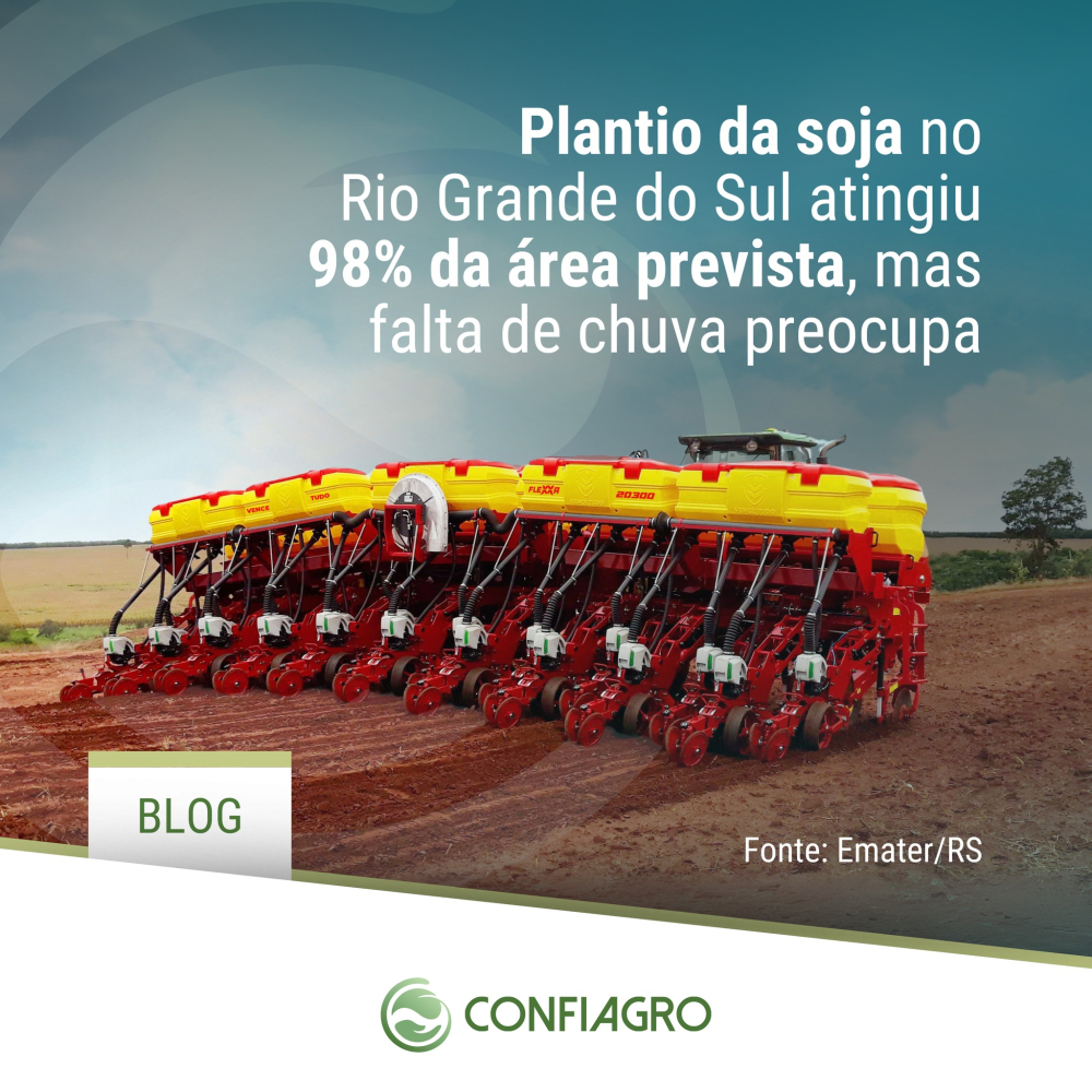 #BlogConfiagro | Segundo dados da Emater/RS, a semeadura da soja no Estado está praticamente finalizada, com 98% da área total plantada. Esse índice é superior ao de 97% registrado na semeadura anterior.